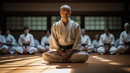 A skilled martial artist with a gray beard stands in a dojo, hands clasped in a gesture of respect. The warm light illuminates his concentrated expression as he prepares for training.