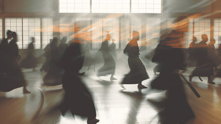 Aikido, sports and martial arts training class with students and sensei, self defense and discipline. Fitness, fight and education, black belt with Japanese people and workout for exercise in dojo.