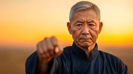 An elderly man practices Tai Chi, showcasing focus and strength. His determined expression reflects peace. The background features a soft sunrise, enhancing the tranquil atmosphere.