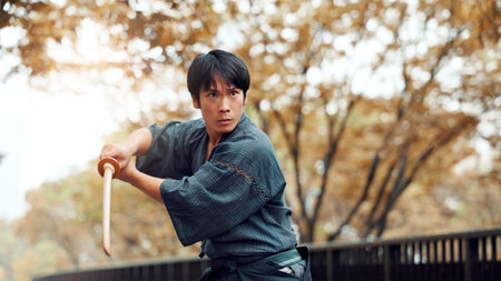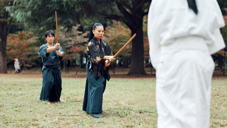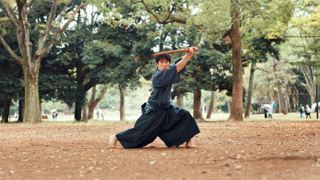 Bokken, Japanese person and outdoor as practice, exercise and sport in culture or martial arts. Performance, weapon and heritage for challenge, combat or training as self defense technique in bojutsu