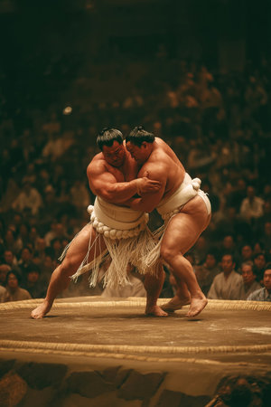 Two sumo wrestlers engage in a powerful duel with one athlete throwing the other over his shoulder. The setting captures the intensity of traditional sumo wrestling in Japan's historic arenas.