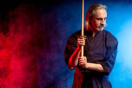 confident strong mature kendo warrior with shinai in hands, preparing for kendo competitions, fighting. isolated smoky space