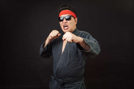 cool karate fighter in sunglasses. comical man in kimono with clenched fists going to kick. isolated black background.