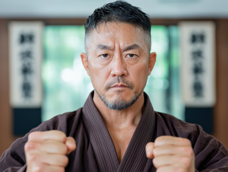 Focused gray haired karateka practicing fighting stance in traditional dojo, demonstrating martial arts skills and discipline
