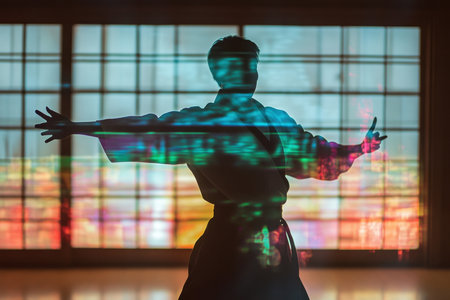 A martial artist practices forms in a dojo, showing skill and focus against vibrant light backgrounds.