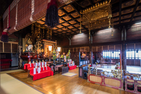 Sendai, Japan 03/06/2019: View of the Rinno-ji Temple at sunset. This is a traditional Shinto temple with religious idols and decorations.