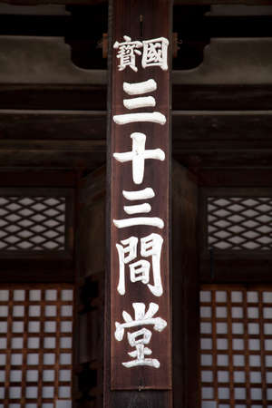 Japan, writing and wood with Japanese, spiritual and pillars with sign on a urban road outdoor. Travel, path and Asian culture with ancient structure with history in Hanamikoji Street in Kyoto