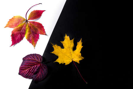 Colorful autumn leaves on a dark background. Flat lay, top view.
