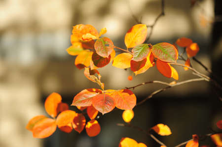 Close up of a different colored leaves in autumn. Blur orange bokeh background