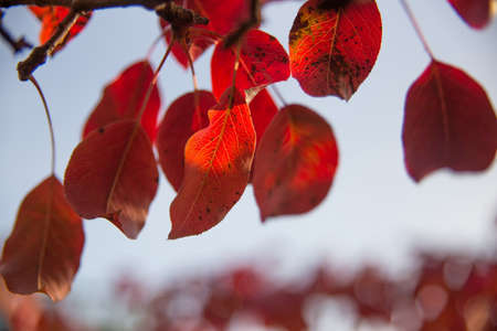 Bright red autumn leaves illuminated by sunlight against the sky, close-up, soft selective focus. Abstract natural background.