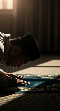 Muslim man praying inside mosque, kneeling on carpet, expressing devotion