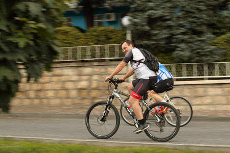 Pyatigorsk, Russia - August 13, 2018: Unknown cyclists with backpacks ride down on urban street. Active lifestyle