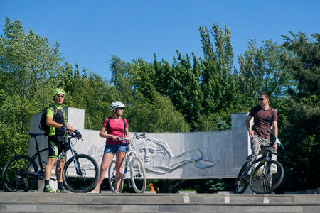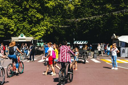 Rostov-on-Don / Russia - may 2018: people with different bikes gather in central park in front of the annual city cycling parade on a warm sunny spring day