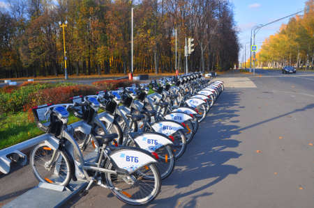 MOSCOW, RUSSIA - OCTOBER 22, 2018: Bicycle parking on Universitetsky Avenue near the Moscow State University building.
