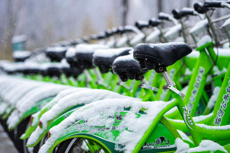 Tel Aviv Israel January 14, 2020 View of bicycle to hire parked in the streets of Tel Aviv in the afternoon