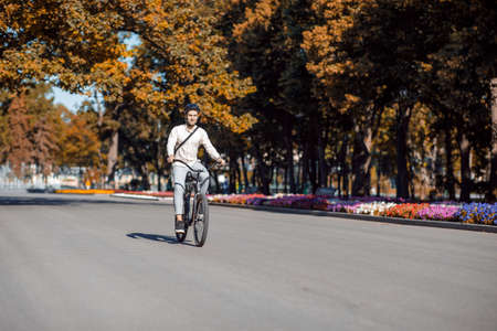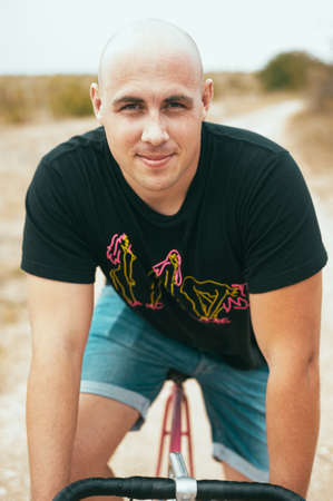 Young male sportsman riding a bike on open air
