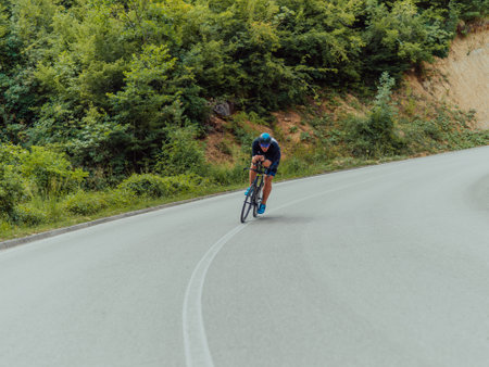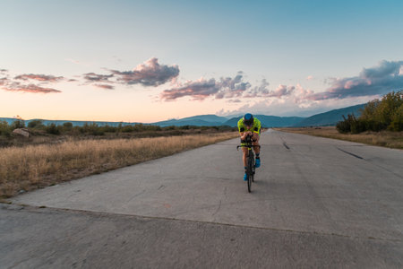 Triathlete riding his bicycle during sunset, preparing for a marathon. The warm colors of the sky provide a beautiful backdrop for his determined and focused effort.