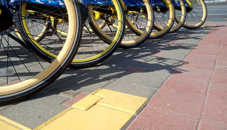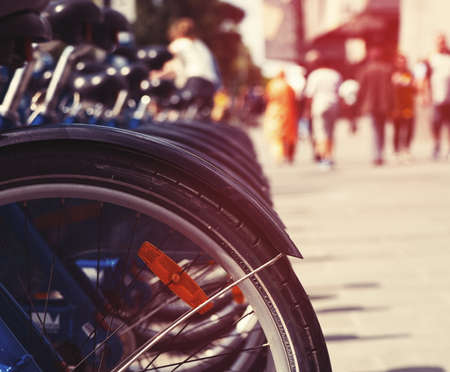 Bicycle rental on the city street. Ecological transport. Health and sports.