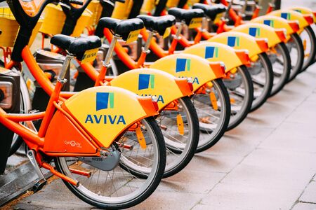 Vilnius, Lithuania. Row Of Colorful Bicycles AVIVA For Rent At Municipal Bike Parking In Street.