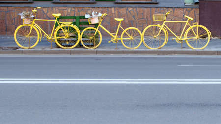 old bicycles painted bright yellow color on the footpath of city street