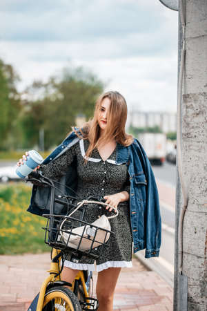 smiling young woman standing near bicycle and looking at urban street in europe