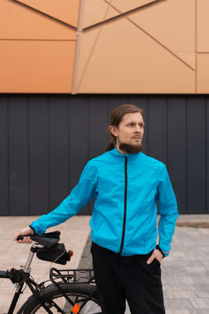 A man in a blue jacket is holding his bicycle in the city. high quality photo