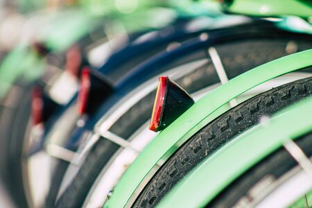 Lisbon Portugal july 25, 2020 View of accessible bicycle to hire for short periods of time, usually for a few hours parked in the street and part of the public transport system of Lisbon