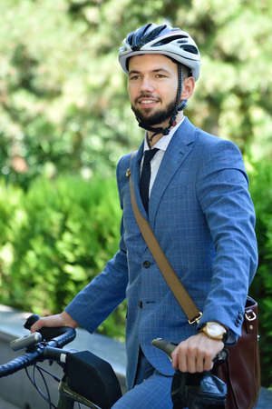 Happy bearded businessman in helmet with bicycle. Business and urban style concept. Close up