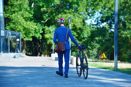 Young businessman in blue suit and helmet with bike walking in park. Business and urban style concept.