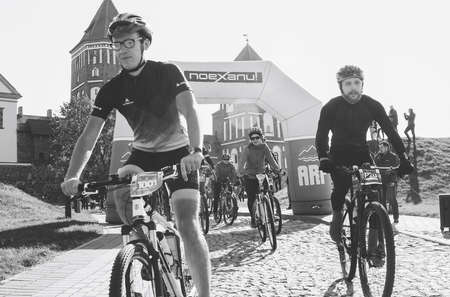 October 6, 2018 Novogrudok Belarus Castle Road There are cyclists who ride at the start of the marathon in front of the castle.Black and white image