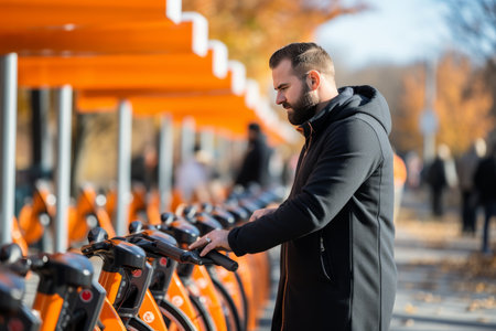 Young man at a bike-sharing station on a sunny autumn day, selecting a bicycle.