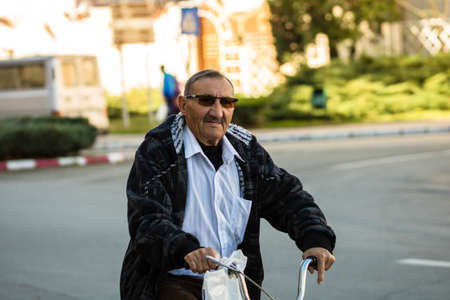 Old man riding a bike in downtown of Lugoj, Romania, 2020