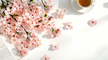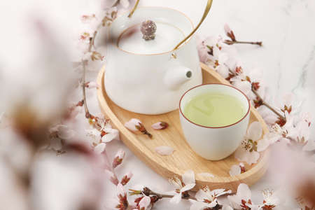 Cup of morning freshly brewed green tea in a traditional cup on wet light surface decorated with spring blooming branch and white petals