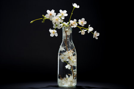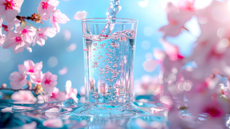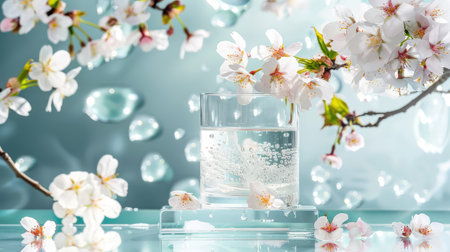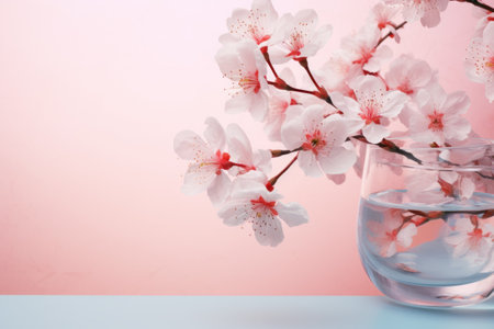 Cherry blossom in a glass of water with water drops.
