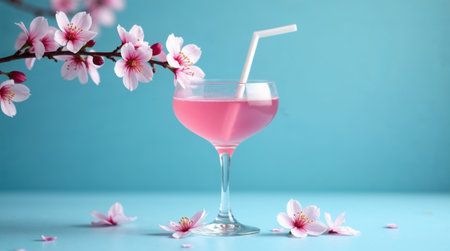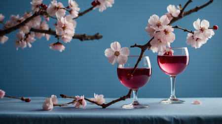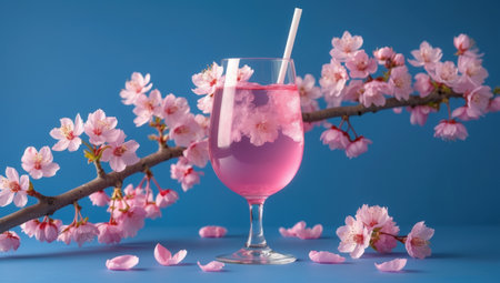 Cherry blossom and glass of cherry juice on blue sky background