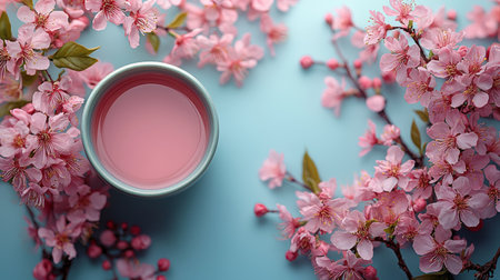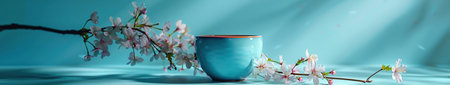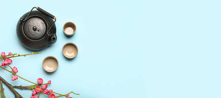 Traditional Chinese tea with blooming tree branch on blue background with space for text