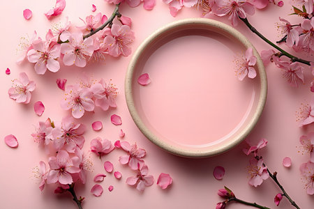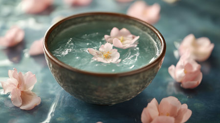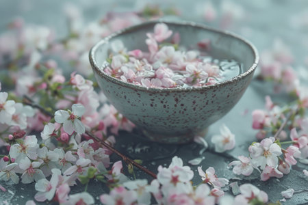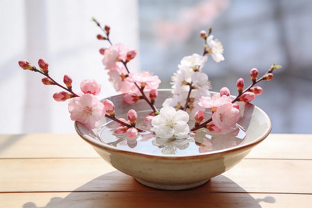 Soft pink and white cherry blossoms are artfully arranged in a shallow ceramic bowl filled with clear water, creating a serene spring display