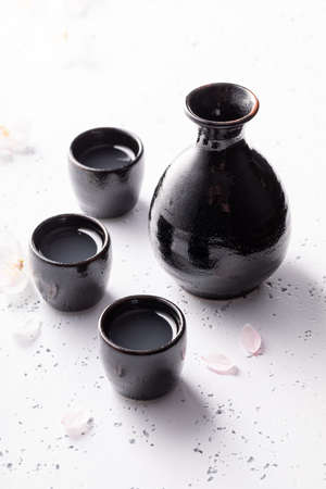 Unfiltered sake with blooming cherry. Japanese habit of drinking alcohol. Black ceramics on a white stone.