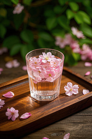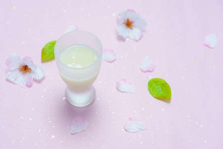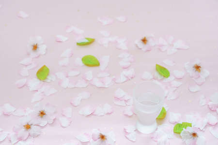 Prepared to drink sake with blooming flowers