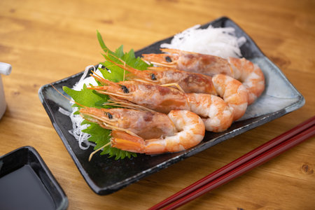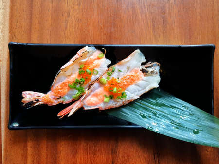 Japanese food style, Top view of raw shrimps with bamboo leaves on black plate on wooden table in restaurant, Botan mentai is Japanese traditional, Fresh meat for grill or cooking