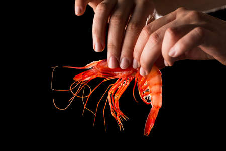 Hand holding fresh prawn isolated on black background.