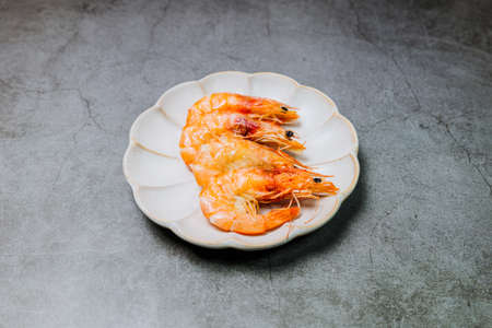 Red shrimp on a white plate and a matte black background. Delicious peppery appetizer on a platter. Fresh shrimp in the group.