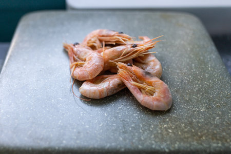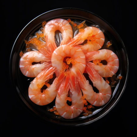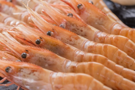 Boiled shrimp on black glass