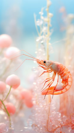 Shrimp in the sea with pink and white flowers, AI