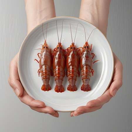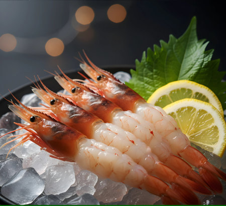This captivating image showcases a beautiful arrangement of fresh red shrimp on ice, presented in a stylish dish. Perfect for culinary inspiration.