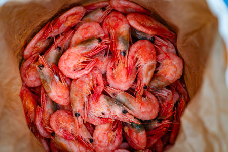 Frozen shrimps in paper bag close-up. Dry freeze food. Seafood delicacies. Selective focus