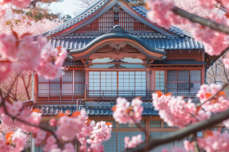 A stunning temple surrounded by vibrant pink cherry blossoms, creating a serene spring ambiance. Perfect for travel, nature, or architectural themes.