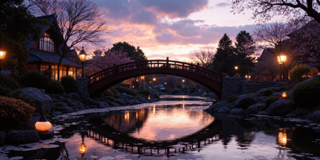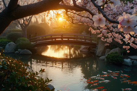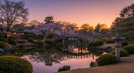 Japanese garden at sunset with cherry blossom trees, bridge and pond