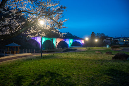Cherry blossoms and an illuminated railway bridge