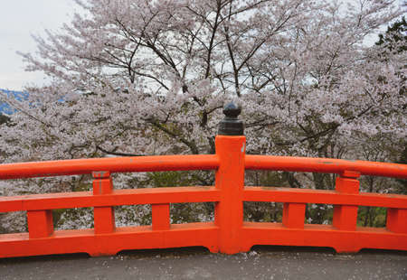Red brigde with cherry flowers in Yoshino, Nara, Japan. The annual cherry blossom festival is a cultural tradition for thousands of years in Japan.